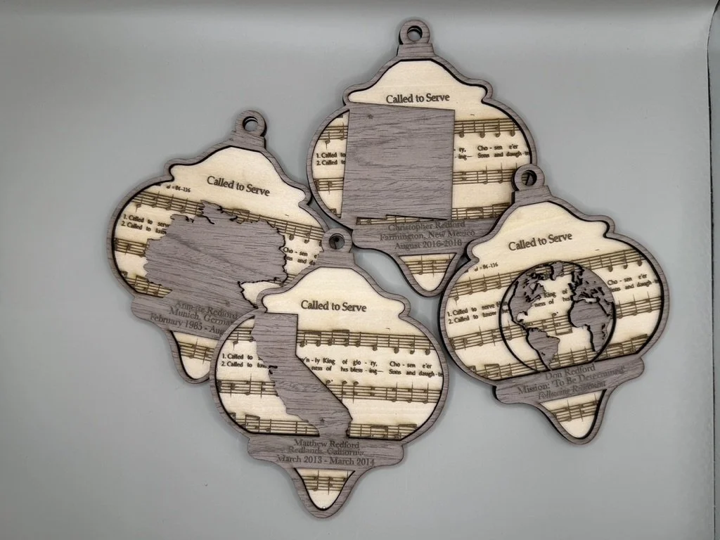 Bring the true meaning of Christmas into your home with this beautifully crafted Nativity Ornament Collection. Each ornament is laser-engraved and precision-cut from rich walnut wood layered beneath a crisp white top piece, creating a warm, dimensional silhouette that stands out on any tree.